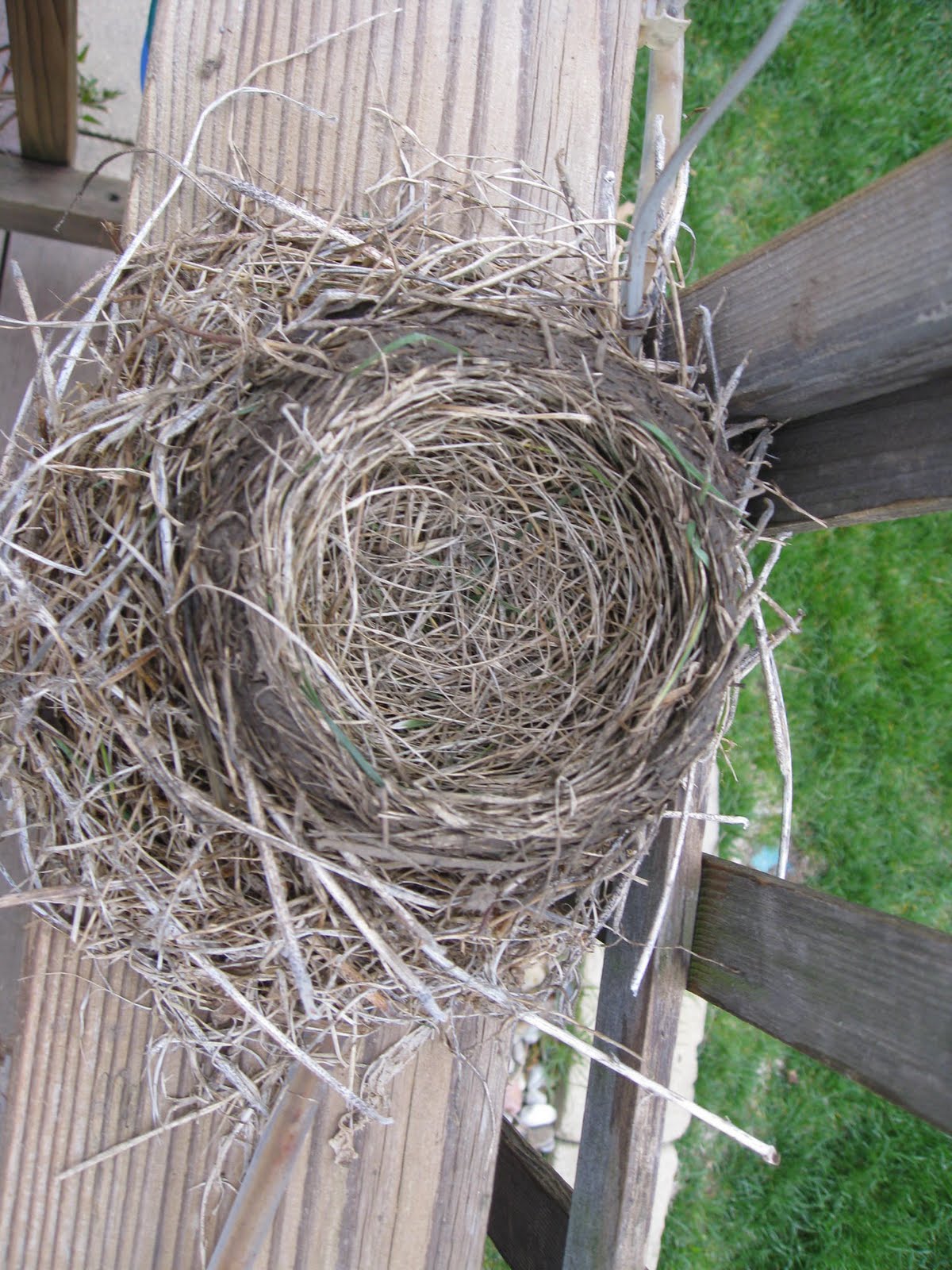 We are now at my folk's house in Nebraska for a while. A couple of weeks ago we noticed a robin trying to build a nest on the rail of the deck. We didn't think she had a chance, because the wind kept blowing it apart. Well, on one of our non windy days, she went to town! Vel had just got done staining the deck, so the rope lights are out of place. So Lady robin intertwined her nest in the rope lights and packed some mud along with it and it seems quite sturdy now.